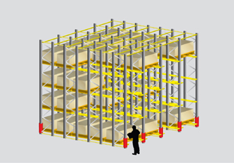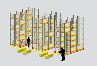 Este tipo de instalación permite una conveniente selección y apoyo entre si de los bultos para lograr almacenar la mayor cantidad de carga por unidad de superficie y por ende aprovechar al máximo la profundidad del túnel de operación. En este sistema los pallets son colocados sobre carros rodantes y el último de estos es empujado por el auto elevador cuando éste almacena la siguiente carga. La operación de descarga se efectúa mediante el conocido principio LIFO (Last In First Out).