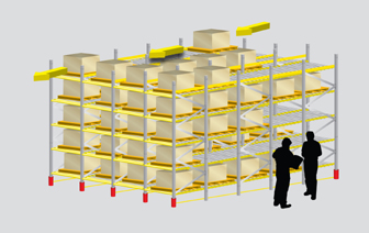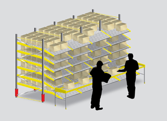 Este tipo de estantería metalica posee planos de carga con una inclinacion necesaria para lograr una aceleración adecuada en la carga. Los planos de cargas son perfiles que poseen en su interior pequeñas ruedas plásticas distanciadas entre sí según las dimensión de bultos con la que opera la estantería . En esta instalación la carga se coloca en el extremo más alto y se desliza sobre las ruedas plásticas hasta el otro extremo de operación por efecto de la gravedad en un plano inclinado. Este sistema permite un buen intercambio de productos no interfiriendo en la operación de reponer o retirar dicha carga con una gran disminución en el tiempo de entrega de los productos requeridos.